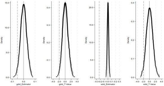 The parallel trend test preliminarily verified the inhibition effect of the cooperative “demonstration cooperative” policy on an “empty shell”, and the implementation of the demonstration cooperative policy had a specific continuous effect (see Appendix A). To test that the impact of the “demonstration cooperative” on the “empty shell” cooperatives is not caused by other random factors, this study uses a placebo test to identify the chance of the policy effect of the “demonstration cooperative”, mainly by changing the time of implementation of the cooperative “demonstration cooperative” policy and random sampling of policy interaction items.