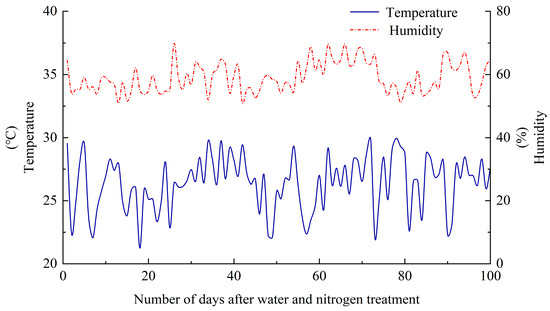 The experiment was conducted with two factors: the irrigation level and nitrogen application rate. A quadratic saturation D–optimal design (6–point design with p = 2) was adopted, and a treatment IN7 with the highest code value was added. Temperature and humidity are collected with a temperature and humidity RR-9100 logger (Beijing Yugen technology co led., Beijing China) in Figure 1. This treatment was only used as a reference and did not participate in regression analysis to maintain the superiority of the original plan (Table 1).