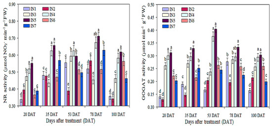 Effects of irrigation water with nitrogen coupling of sand−cultivated cucumbers using a quadratic saturation D−optimal design on nitrate reductase activity and glutamate synthase activity. Note: IN1: 65% irrigation with 150 kg N hm−2; IN2: 100% irrigation with 150 kg N hm−2; IN3: 65% irrigation with 1250 kg N hm−2; IN4: 80% irrigation with 623 kg N hm−2; IN5: 89% irrigation with 1250 kg N hm−2; IN6: 100% irrigation with 917 kg N hm−2; IN7: 100% irrigation with 1250 kg N hm−2. DAT: days after irrigation water and nitrogen treatments. The error bars represent the value of the standard deviation (SD), and different lowercase letters indicate significant differences at p < 0.05.
