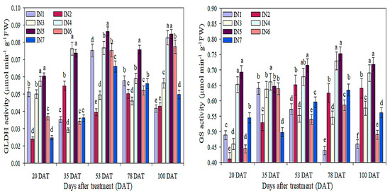 Effects of irrigation water with nitrogen coupling of sand−cultivated cucumbers using a quadratic saturation D−optimal design on glutamate dehydrogenase activity and glutamine synthase activity. Note: IN1: 65% irrigation with 150 kg N hm−2; IN2: 100% irrigation with 150 kg N hm−2; IN3: 65% irrigation with 1250 kg N hm−2; IN4: 80% irrigation with 623 kg N hm−2; IN5: 89% irrigation with 1250 kg N hm−2; IN6: 100% irrigation with 917 kg N hm−2; IN7: 100% irrigation with 1250 kg N hm−2. DAT: days after irrigation water and nitrogen treatments. The error bars represent the value of the standard deviation (SD), and different lowercase letters indicate significant differences at p < 0.05.
