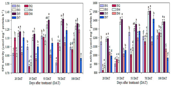 Effects of irrigation water with nitrogen coupling of sand−cultivated cucumbers using a quadratic saturation D−optimal design on sucrose phosphate synthase activity and sucrose synthase activity. Note: IN1: 65% irrigation with 150 kg N hm−2; IN2: 100% irrigation with 150 kg N hm−2; IN3: 65% irrigation with 1250 kg N hm−2; IN4: 80% irrigation with 623 kg N hm−2; IN5: 89% irrigation with 1250 kg N hm−2; IN6: 100% irrigation with 917 kg N hm−2; IN7: 100% irrigation with 1250 kg N hm−2. DAT: days after irrigation water and nitrogen treatments. The error bars represent the value of the standard deviation (SD), and different lowercase letters indicate significant differences at p < 0.05.