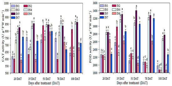Effects of irrigation water with nitrogen coupling of sand−cultivated cucumbers using a quadratic saturation D−optimal design on catalase activity and peroxidase activity. Note: IN1: 65% irrigation with 150 kg N hm−2; IN2: 100% irrigation with 150 kg N hm−2; IN3: 65% irrigation with 1250 kg N hm−2; IN4: 80% irrigation with 623 kg N hm−2; IN5: 89% irrigation with 1250 kg N hm−2; IN6: 100% irrigation with 917 kg N hm−2; IN7: 100% irrigation with 1250 kg N hm−2. DAT: days after irrigation water and nitrogen treatments. The error bars represent the value of the standard deviation (SD), and different lowercase letters indicate significant differences at p < 0.05.