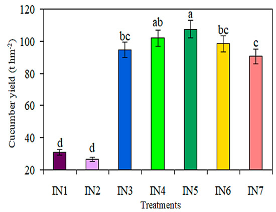 The IN4 and IN5 treatments had significantly (p < 0.05) greater leaf nitrogen contents during various growth stages of cucumber than the rest of all other treatments (Table 3). There were non-significant differences in leaf nitrogen content at the IN4 and IN5 treatments during various growth stages. Samples from the IN4 treatment had significantly higher leaf nitrogen content than that of all of the other treatments at each growth stage (with the exception of the IN5 treatment). During the 2021 study year, the IN4 and IN5 treatments significantly increased leaf nitrogen content by 27.5% and 33.1% more than that of the IN1 treatment. The leaf nitrogen content significantly increased from 20 DAT to 53 DAT, while the leaf nitrogen content revealed a considerably decreasing trend from 53 DAT to 100 DAT among all the treatments. The leaf nitrogen content considerably improved by 5.5% more in the IN5 treatment than in the IN4 treatment.
