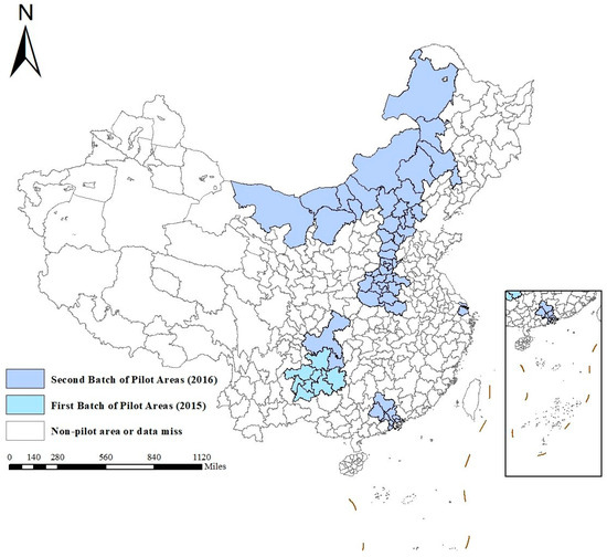 Traditionally, studies have focused on enhancing labor productivity [12], adjusting the land supply [13], and improving transportation infrastructure [14]. However, with the widespread application of internet technology and the development of digital services such as cloud computing and the Internet of Things, big data has emerged as a new production factor that is being rapidly integrated into various aspects of urban production, consumption, and distribution [15,16,17]. There are two main reasons for this shift. First, in the context of the digital economy, land management departments can leverage technologies such as land information systems to improve urban planning, scientifically allocate land construction quotas, and monitor land pollution in real time, directly impacting the ULGUE [18,19,20]. Second, businesses can use big data technology to identify target customers [21], shape consumer perceptions [22], predict market risks [23], and monitor their energy consumption [24], thereby indirectly enhancing the ULGUE by improving their production processes and optimizing their operational efficiencies [25]. To stimulate the development of China’s digital economy, the State Council issued the “Big Data Development Outline” in 2015, officially designating Guizhou Province as the nation’s first comprehensive big data pilot zone. In October 2016, to further implement China’s big data strategy, the National Development and Reform Commission, in conjunction with the Ministry of Industry and Information Technology and other relevant departments, approved the initiation of NBDCPZ construction in seven regions, including Beijing, Tianjin, Inner Mongolia, and Henan (see Figure 1 for the spatial distribution of the NBDCPZ regions). According to the construction plan, the pilot cities aim to explore data center integration and utilization, data resource open sharing, and the development of data industry clusters within the big data domain. Additionally, the big data industrial parks focus on key digital economy industries such as artificial intelligence, 5G, blockchain, and the Internet of Things, promoting the application of cutting-edge digital technologies within the pilot zones to spur overall digital economic development in these areas.