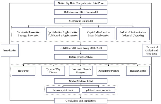 The subsequent sections of this paper are organized as follows: Section 2 outlines the theoretical analysis and hypotheses. Section 3 introduces the model setting, variable descriptions, and data sources. Section 4 reports the empirical results, including those from the benchmark regression, parallel-trend, and robustness tests. Section 5 delves into the mechanisms underlying the impact of the NBDCPZ policy on the ULGUE. Section 6 examines the heterogeneity impact and spatial spillover effects of the NBDCPZs. The conclusions and implications are presented in Section 7. The research framework is shown in Figure 2.