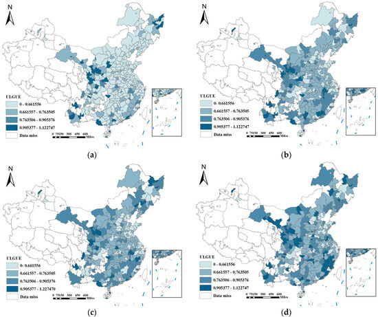 Figure 3 illustrates the spatial distributions of the ULGUEs in the sample cities for the years 2006, 2011, 2016, and 2021. Overall, the ULGUEs in China have shown a significant improvement over the years. Spatially, the ULGUEs are higher in the southeastern coastal and western regions, exhibiting a clear spatial clustering tendency. This finding is consistent with the results reported in other literature [67].