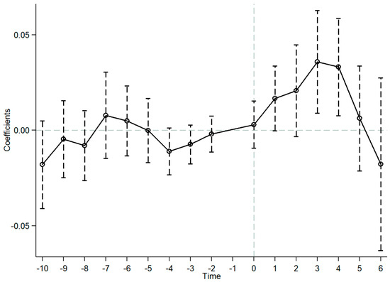 where denotes a series of dummy variables. A value of 1 is assigned to if city i is on the NBDCPZ policy list and if the observation period is precisely t years before the NBDCPZ establishment. Similarly, a value of 1 is assigned to if the observation period is exactly t years after the NBDCPZ establishment. Otherwise, the value is set to 0. The first year before the NBDCPZ establishment (i.e., ) serves as the benchmark year. Figure 4 presents the parallel-trend test results, with the horizontal axis indicating the years relative to the NBDCPZ establishment and the vertical axis indicating the estimated results.