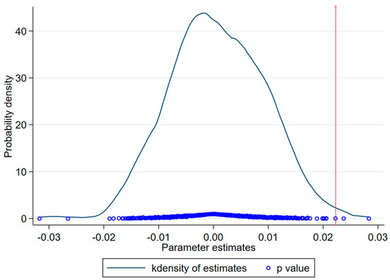 Although the benchmark model included a series of control variables and city–year fixed effects to address potential confounders affecting the ULGUE, other unknown factors may have still interfered with the results. To further validate the reliability of the results, we randomly selected 55 cities from the pool of 281 cities, matching the actual number of pilot cities. For each selected city, a year between 2006 and 2021 was randomly chosen as the policy implementation year. This process was repeated 500 times, with an empirical regression conducted for each iteration. Figure 5 illustrates the distribution of these 500 “false” estimated results, which are centered around zero, confirming that unobservant factors did not significantly affect the benchmark result accuracy.