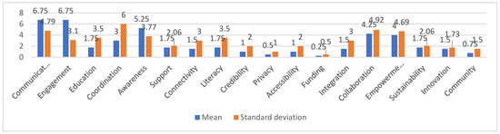 Themes such as collaboration, empowerment, sustainability, innovation, and community have comparatively low mean scores, indicating that they are mentioned less frequently in comparison to other themes. Nevertheless, the higher standard deviations in the discussion of collaboration and empowerment imply that although these topics may not be widely discussed in general, there is significant variation in the degree to which they are emphasized or given priority in different discussions or by different respondent groups.