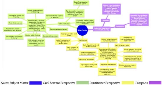 The FGD process and procedure provide a good basis for developing a qualitative visual diagram—a mind map of the issues and concerns, as well as the quantitative outcome []. On the one hand, this approach simplifies the illustration of the challenges, opportunities, and prospects associated with urban farming innovation from a practitioner and civil servant perspective. On the other hand, it provides a baseline for more complex and comprehensive future research. The mind map is depicted in Figure 1. The complexity and extent of the mind map implies that a concise overview of the challenges, opportunities, and prospects associated with urban farming innovation is cumbersome without further analysis. Therefore, a simplified consensus index is estimated and explained in detail in Section 4. However, the mind map provides some relevant initial insights.