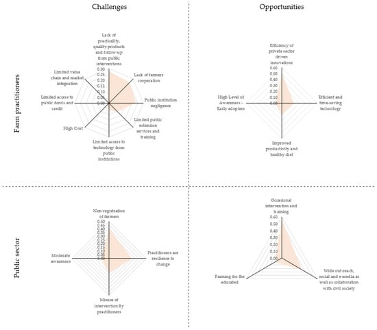 From the perspective of the public sector, urban farmers’ lack of cooperation and resistance to change represent substantial obstacles to the advancement of innovative farming practices. The public sector perceives cooperation among urban farmers as essential for collective progress and the successful implementation of new methods. Without a collaborative approach, the public sector believes that the potential benefits of innovative farming practices may be hindered or delayed. Moreover, the public sector identifies urban farmers’ resistance to change as a significant challenge. This perceived resistance (which might be rational from the side of the farmers, due to being left alone with the risk associated with innovations) can manifest in various forms, such as a reluctance to adopt new techniques or technologies, skepticism towards unfamiliar approaches, or adherence to traditional farming methods. Such resistance impedes the integration of innovative practices into urban farming systems and slows down the pace of sustainable development. Furthermore, the public sector highlights the insufficient utilization of programs and interventions by urban farmers as another major obstacle. Despite the modest public programs and interventions aimed at promoting innovative farming practices, urban farmers may not fully engage with these programs due to various reasons, such as a lack of awareness, access barriers, or perceived ineffectiveness. This underutilization of programs and interventions limits the potential impact of public sector efforts to foster innovation and sustainability in urban agriculture.