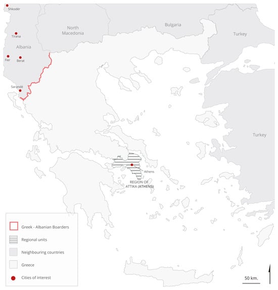 The main factor that facilitated Albanian mobilities towards Greece is the border that the two countries share—a mountainous zone, difficult to control, of more than 280 km. The geographic proximity shaped migration patterns and fostered transnational economic, personal, and cultural ties between the two countries [31]. The border was the gateway for most of the migrants that moved towards Greece since the 1990s, regardless of which part of Albania they came from. Scholars have demonstrated that the Albanian population consists of a complex migratory group with important heterogeneities reflecting, among others, differences in the generational status, ethnic and spatial origins, length of stay, legal status, or employment conditions of its members [29,31,32,33]. For the needs of this analysis, we observed the pathway of Albanians coming from different cities, such as Shkoder in the north, Fier and Berat in central Albania, or Saradë in the south (Figure 1).
