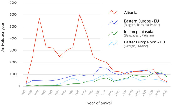 Albanian nationals started arriving in Athens in great numbers in the early 1990s due to the political turmoil in Eastern Europe. This migratory wave continued throughout the decade, with a second increase around 1997–1998 due to the pyramid investment schemes that took place in Albania, resulting in the collapse of the local economy [34] (Table 1 and Figure 2).