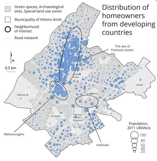 As seen in Figure 3, homeowners from developing countries are concentrated in the northern part of the municipality, especially around the main vertical axis of Patission Street and the Metaxourgeio neighborhood, both ethnically mixed [14,20,49] and deprived areas [12,50].