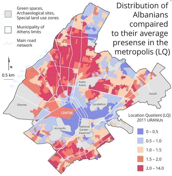 Albanians are dispersed, spreading throughout the municipality (Figure 4). In order to map their distribution in the municipality of Athens, we calculated a location quotient (LQ). The LQ is estimated by comparing their presence in a given URANU to their average presence in the municipality of Athens. An LQ score below 1 indicates the under-representation of Albanians, in blue colors, and an LQ score above 1 indicates the over-representation of Albanians, in red colors, compared to their average presence in Athens. An LQ of 1 indicates that their presence is proportional to their contribution in the rest of the municipality.