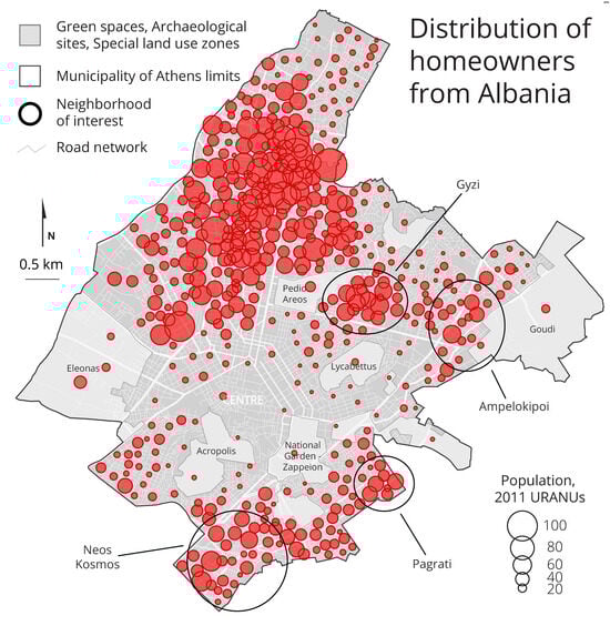 Distribution of homeowners from Albania, Municipality of Athens, URANUs level 2011. Source: EKKE 2015 [35]; data processed and mapping by the authors.