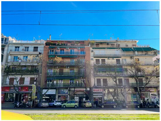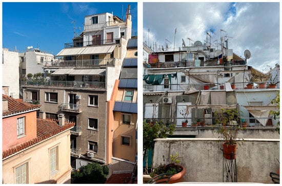 The Athenian housing stock produces a relatively homogeneous setting, especially in central urban areas. Most of the Athenians reside in apartment buildings, built on small plots—often smaller than 500 m2—with an average of 15 apartments and 5–7 floors. Furthermore, most of these buildings were erected between 1960 and 1980 [3]. The prevalent mechanism of housing promotion throughout that period was the antiparochi system, which is a market-based mechanism of housing production associated with the massive densification and spread of the typical post-war apartment buildings (polykatoikies) following a triangulated form of building processes including a landowner; a small contractor, with whom they formed a joint venture to carry out a single operation, at the end of which they split the apartments according to their initial contract terms; and buyers [17,21]. Throughout this otherwise homogeneous (and relatively new) housing stock, differences do occur. They are expressed via access to homeownership, housing quality and amenities, or location. Furthermore, the floor of residence in the apartment building (polykatoikia) is also important, since it produces a social or ethnic stratification by floor of residence. Upper floors are more advantageous, offering higher living standards, while lower floors—ground floor and underground apartments—are much smaller, darker, and noisier [20,22,23].