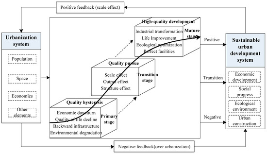 Referring to existing research results [40,41], urbanization and sustainable urban development are two aspects by which to measure urban systems, and their coordinated evolution is key to the healthy operation of these systems (Figure 1). Urbanization systems comprise the population, space, economy, and other elements, and their development entails a process of population agglomeration, spatial extension, and economic growth. Sustainable urban development includes economic development, social progress, ecological environmental development, and infrastructure construction. Considering the current spatial imbalance between urbanization and sustainable urban development, urbanization process generally has three stages of development, including primary stage of quality lag, transitional stage of quality catch-up, and mature stage of high-quality development.