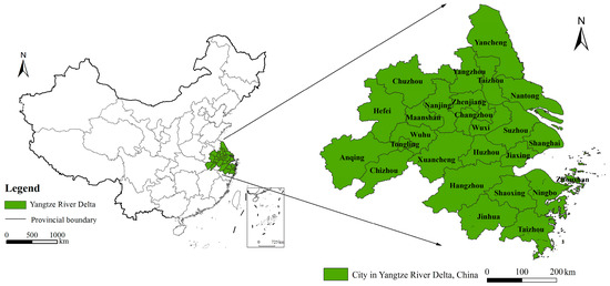 The research selected panel data from 26 cities in YRD from 2000 to 2020. Basic data were obtained from the China City Statistical Yearbook (2000–2020), and the statistical yearbooks of Shanghai, Jiangsu, Zhejiang, and Anhui (2000–2020). All indicators are converted by CPI index, fixed assets investment price index, etc. to eliminate price impact. In response to the situation of missing data for individual years, the research has carried out moving average processing.