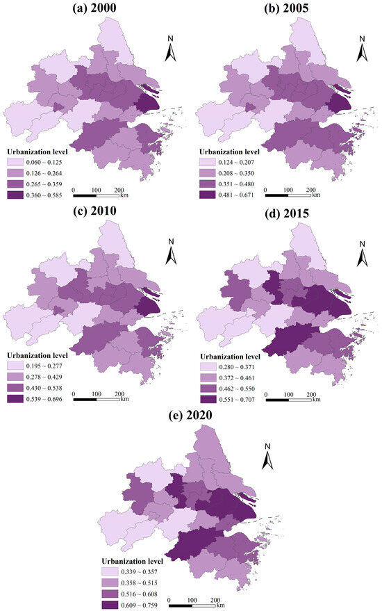 From 2000 to 2020, the level of urbanization in the YRD showed continuous annual improvement. Core cities such as Shanghai, Nanjing and Hangzhou exhibited high levels of urbanization and significant polarization characteristics. Conversely, peripheral cities like Yancheng and Xuancheng experienced limited attraction to the factors such as labor, resources, and funding due to their lower level of economic development, thus widening the urbanization gap with central cities. The increasing trend of sustainable urban development was also notable, along with the spatiotemporal evolution trend of urbanization.