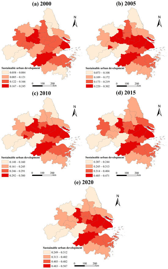 Using the natural discontinuity method in ArcGIS10.2, the evaluation results of urbanization and urban sustainable development level were divided into four levels (Figure 3 and Figure 4). Figure 3 shows the changing trend in the urbanization level in the YRD from 2000 to 2020. The findings show that the urbanization level of each city continuously improved, and had significant spatial differences. Typically, the urbanization level of core cities such as Shanghai, Nanjing, Hangzhou, and Suzhou, was the highest. Industrialization and marketization have significantly promoted the urbanization development. By 2020, the urbanization level of central cities became more prominent, with significant polarization characteristics. However, Yancheng and Taizhou in Jiangsu, Chuzhou and Xuancheng in Anhui, and other peripheral cities showed a low level of economic development owing to a lack of agglomeration capacity for factors such as labor, resources, and funding. Compared to the urbanization development of central cities, they also showed a gap. This is because resource endowment and location conditions directly affect the performance of these cities. In future, initiatives should be implemented to undertake industrial spillovers of central cities and accept their development radiation. It is also necessary to coordinate development, infrastructure interconnection, and public service integration towards the “new normal” to improve the level of sustainable urbanization. The overall pattern of sustainable development follows a “core-periphery” circular distribution, wherein primary cities in the YRD form the center of urban agglomeration, surrounded by other cities.
