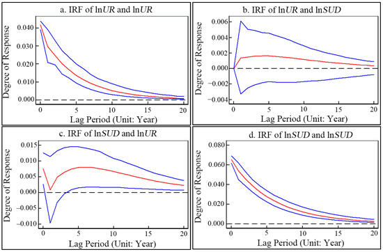 Variance decomposition reflects the extent to which one variable accumulated over time is affected by the impact of another variable. It assesses the relative cumulative contribution rate of each variable and then measures the importance of each variable in explaining changes in other variables [52,57]. The results shown in Table 7 indicate that, in terms of contribution rate, urbanization has greater impact on sustainable development than vice versa. In phase 1, the contribution rate of urbanization to sustainable urban development was 0.23%, while that of sustainable urban development to urbanization was 0.00%. Over time, the contribution rates gradually increased to 25.15% and 15.54% in the 20th period. The impact of urbanization and sustainable urban development on themselves decreases, and the weakening trend of the impact of sustainable urban development on itself is prominent. Urbanization and sustainable urban development have certain path-dependent characteristics and follow an inertial development trend. At the initial stage of implementing the sustainable development promotion policies, the contribution to their own development was not <95%. In phase 5, the contribution of the interaction between urbanization and sustainable urban development was approximately 5%. In addition, explanatory power gradually increased over time. In subsequent periods, the impact of urbanization on sustainable urban development gradually increased, while the impact of sustainable urban development on urbanization decreased.