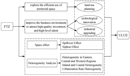 Enhancing the efficiency of land resource allocation is a crucial element in the development strategies of each Free Trade Pilot Zone. For instance, “In the Free Trade Pilot Zones, land is supplied based on the industrial chain, with integrated supply for multiple plots of land involved in the key links and core projects of the industrial chain. There is also support for localities in prioritizing the reasonable land use needs of the Free Trade Pilot Zones when arranging land use plans”. Specifically, the Free Trade Pilot Zones have achieved success in models of efficient land use. For example, the Shanghai Free Trade Pilot Zone pioneered a pilot for mixed-use development, innovatively planning the unified construction of research and development facilities and production plants after land acquisition by businesses within the zone, thus achieving efficient land use [69]. Additionally, the Free Trade Pilot Zones explore the implementation of a “negative list”, improve legal regulations such as intellectual property protection and arbitration judicial review, continually expand the areas of openness, and enhance the level of trade and investment facilitation, which benefits the improvement of the business environment and leads to an upgrade in the industrial structure within the zone [70], thereby enhancing urban land use efficiency. Accompanying the institutional innovations of the Free Trade Pilot Zones are reductions in institutional transaction costs and the inflow of high-quality investments and high-level talents, which favor technological innovation and, in turn, boost urban land use efficiency [71].