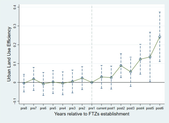 where ULUEit represents the urban land use efficiency of the city i in year t, and α is the constant term; DIDit is the policy dummy variable. Controlit represents a series of control variables that may affect urban land use efficiency independently of FTZ policy, all of which are control variables of baseline regression. μi is the individual (city) fixed effect, indicating the characteristics of the city level that do not change with time, such as the city’s terrain, climate, and other natural conditions. λt is the time fixed effect. In addition, after considering that the influence of province characteristics on land use efficiency has time-varying characteristics, the interactive fixed effect of province and year is added to the equation, i.e., ηpt. εit is the classic random error term. This paper is mainly concerned with the coefficient β in the equation, which is the impact of the implementation of the FTZ policy on urban land use efficiency. The following analysis defaults to clustering standard errors at the city level.