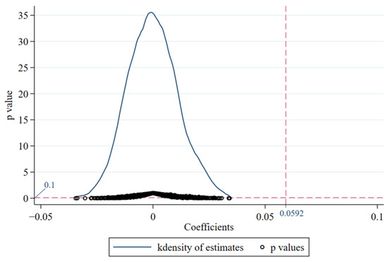 The baseline regression results confirm that FTZ policy can improve urban land use efficiency. However, this result may be influenced by other random factors, and the regression results above could be biased due to other confounding policies or unobserved factors. Therefore, a random policy treatment group was obtained by randomly sampling samples and randomly generating the policy implementation year. Meanwhile, interaction terms of pseudo-virtual policies were generated for placebo tests. In order to enhance the effectiveness of the placebo test, this paper randomly selected 1000 samples and conducted 1000 regression iterations according to model (1). Figure 4 illustrates the coefficient kernel density obtained from regression and the corresponding p-value distribution. The centers of distribution of the coefficients from the random sampling test are all near zero, significantly different from the estimated coefficient of the baseline regression (dashed line value = 0.0592). Most of the p-values are greater than 0.1, indicating that the coefficients are not statistically significant, at least at the 10% level. This suggests that the baseline regression results are robust and less affected by other policies or unobservable factors.