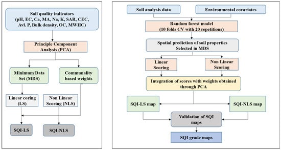 Predicted rasters of indicator soil properties were used to map SQI. Individual rasters of soil properties were subjected to linear and non-linear scoring methods as outlined in the methodology section (Figure 2), which was performed in raster calculator functionality in ArcGIS 10.5. After obtaining the indicator score rasters, each was multiplied by its corresponding weight derived from the commonalities identified during the PCA. These weights were assigned based on the contribution of each indicator to the overall SQI. Finally, all these weighted indicators score rasters were added to generate the SQI map and the accuracy of these generated SQI maps was assessed. Further, the generated SQI maps were classified into five grades (Table 2), using standard deviation as class interval [14] and the area corresponding to each class was calculated.