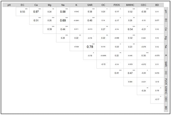 Correlation between soil properties (p-values 0.001-***, 0.01-**, 0.05-*).