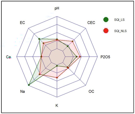 SQI-LS values ranged from 0.10 to 0.64, with a mean of 0.39, while SQI-NLS exhibited a broader range of 0.12 to 0.78, with a mean value of 0.48. The assessment of individual soil properties’ contributions to the SQI using linear scoring and non-linear scoring methods is shown in Figure 4. Under SQI-LS, sodium (Na) emerged as a significant contributor (constituting 25.69% of the SQI); conversely, potassium (K) exhibited a lower influence of 5.66%. In SQI-NLS, sodium was the primary influencer, but its impact was decreased to 15.85%, while potassium’s (K) influence increased to 13.28%.