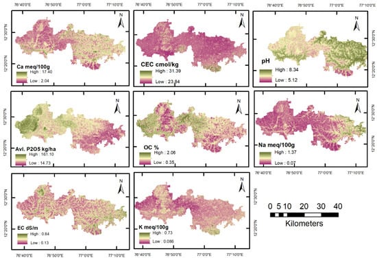 Using the tuned random forest model, soil property maps of the study area were predicted and depicted in Figure 5. The predicted soil properties ranged from pH 5.12 to 8.34, EC 134 to 847 µS/m, OC 0.35 to 2.06%, Na 0.07 to 1.37 mEq/100 g, CEC 23.8 to 31.3 cmol/kg, Ca 2 to 17.4 mEq/100 g, K 0.08 to 0.73 mEq/100 g, and available phosphorous 14.7 to 161 Kg/ha.