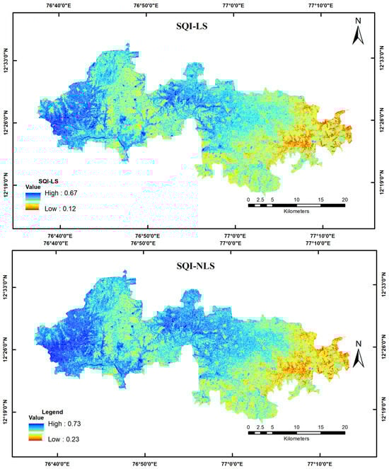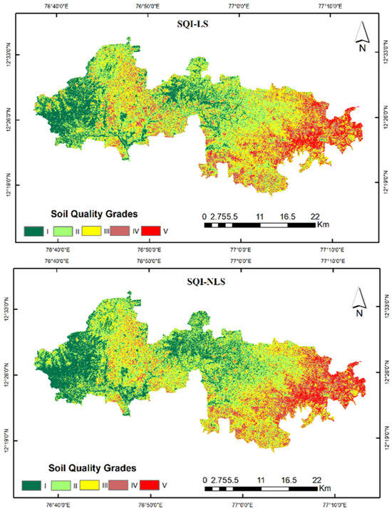 More than 50% of the area fell into grades II and III on SQI maps created using LS and NLS, indicating that most of the study area’s soils have high-to-moderate soil quality. SQI-NLS had more area in grade I (23.27%) than SQI-LS (18.82%). Conversely, SQI-LS had more area in grade IV (18.83%) than SQI-NLS (16.5%), while in both scoring methods, the area under grade V was of a similar extent.