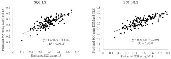 The accuracy assessment of predicted SQI maps was performed using several metrics, including the R2, LCC, RMSE, and bias. Two linear regression plots (Figure 7) were constructed to illustrate the relationships between estimated and predicted SQI values. The results indicate that the non-linear scoring method produced superior predictions, with a higher R2 of 0.66 between predicted and observed SQI values. This method also exhibited low RMSE (0.08), bias (−0.05) values, and a high LCC of 0.66. Conversely, SQI maps established using linear scoring showed slightly lower values of R2 (0.60) and LCC (0.65), along with higher RMSE (0.09) and bias (−0.06) values.