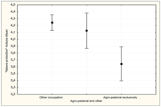 Moreover, considering that people who work in farming and livestock husbandry—of the main stakeholders in the area—are considered to be more or less influenced by the proposed actions, a further statistical analysis was carried out to detect any relationship between the single NEP scale score and the acceptability of the LIFE project actions with occupation. In the island, it is usual for people who work in the agro-pastoral sector to work, also, in different sectors. For this reason, we grouped the occupation of the sample into three groups: those who work in the agro-pastoral sector exclusively, those who work in other sectors in parallel to agro-pastoralism, and those who work in a different sector. The results showed that those who are exclusively farmers scored lower and were significantly differentiated from the rest of the sample, as regards the nature protection and the ecotourism variables (Figure 2 and Figure 3).