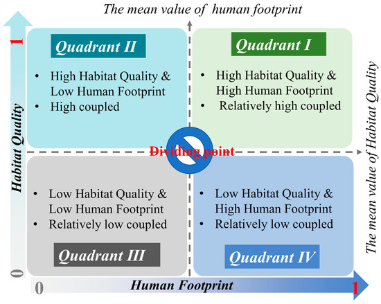 The four-quadrant model defines the coupling state of two indicators, and the interaction between the two indicators can be revealed through the coupling state. In recent years, the four-quadrant model has also been widely used in current research on human activities and ecosystem services [41,42]. We use four quadrants to measure the coupling status between human activities and habitat quality in China. This study used human footprints and habitat quality as the X axis and Y axis, respectively. The average value of the two was used as the threshold with which to divide high and low values and construct four quadrants (Figure 2). For example, quadrant I is an area with a high human footprint and high habitat quality, indicating relatively high coupling between the two systems. Quadrant III has a low human footprint and low habitat quality, indicating relatively low coupling between human activities and habitat quality.