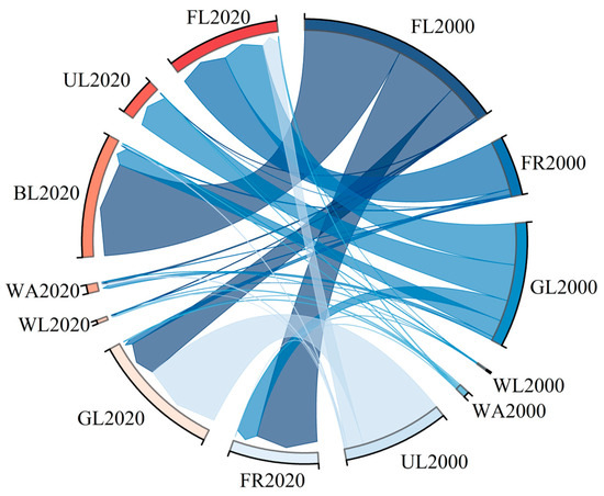 Use conversion map from 2000 to 2020 (FL: farmland, FR: forest, GL: grassland, WL: wetland, WA: water area, BL: built-up land, UL: unused land, unit: km2).