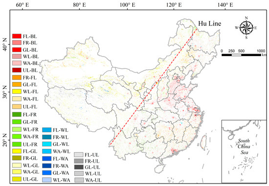 From a spatial transfer matrix perspective, land use shows prominent “Hu Line” spatial differentiation characteristics. Specifically, on the right side of the “Hu Line”, the land-use type transfer is mainly from “cultivated land and other ecological land to construction land” (Figure 4), which is consistent with urbanization in Beijing–Tianjin–Hebei, the Yangtze River Delta, and the Greater Bay Area. The process is inseparable. In addition, this type of transfer is also prominent in the central and western core cities of Xi’an, Zhengzhou, and Zhengzhou. On the left side of the “Hu Line”, the primary conversions are unused land–grassland, cultivated land–grassland, etc. This is closely related to policies such as returning farmland to grassland in the western region.