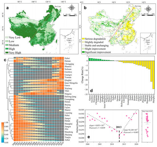 The spatial distribution of mean habitat quality in China from 2000 to 2020 (a); Sen-MK trend change map from 2000 to 2020 (b); habitat quality change heat map (c); change rate of 31 provinces (d); and the country change trend (e).