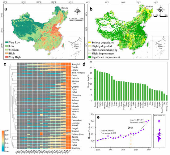Spatial distribution of the mean human footprint in China from 2000 to 2020 (a); Sen-MK trend change map (b); provincial-scale human footprint change heat map (c); change rate (d); and national change trend (e).