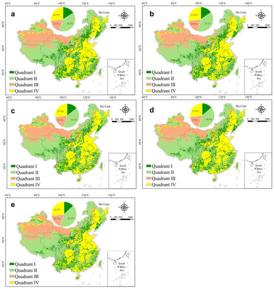Spatial distribution and proportion of the four quadrants between the human footprint and HQ from 2000 to 2020 ((a): 2000; (b): 2005; (c): 2010; (d): 2015; and (e): 2020).