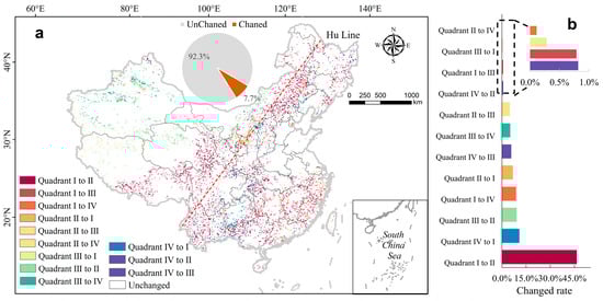 Spatial distribution of transformations in quadrant levels in China from 2000 to 2020, the proportion of quadrant transferred and untransformed areas (a), and proportions of 12 different transferred areas (b).