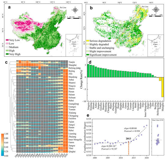 Spatial distribution of the average coupling degree between human footprint and habitat quality in China from 2000 to 2020 (a); Sen-MK trend change map from 2000 to 2020 (b); heat map of coupling index changes in 31 provinces (c); change rate (d); and national trends (e).