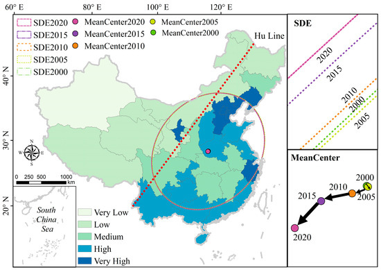 Mean distribution, standard ellipse, and center of gravity migration of the coupling degree between human footprint and habitat quality in China from 2000 to 2020.