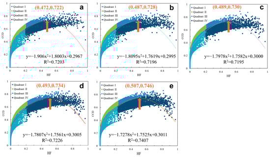 We found that the cubic model may be overfitted by comparing the fitting curves of the quadratic model and the cubic model from 2000 to 2020 (Figure S4). Judging from the data scatter density distribution, most of the data are distributed on the left side of HF < 0.6, and the “CCD-HF” curve shows a trend of “first rising and then falling”. In addition, the cubic model has two inflection points (HF < 0.6 and HF > 0.6). After the first inflection point (HF < 0.6), the cubic model shows an apparent downward trend, which is inconsistent with the trend of the overall curve. Second, after the second inflection point (HF > 0.6), we see that the overall curve density decreases; however, the outlier clusters formed by the higher values of some HFs lead to the formation of a cubic curve fitting to a certain extent. On the contrary, the quadratic model is first consistent with the scatter density path. More interestingly, when HF < 0.6, the quadratic model is almost located at 50% of all scatter paths, which shows that the quadratic model can better fit.
