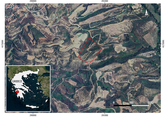 Map of the study (sampling) area, delineated by a red outline, situated within the Ancient Olympia Municipality in Western Peloponnisos, Greece (red dot) (EGSA87 Greek Geodetic Reference System).
