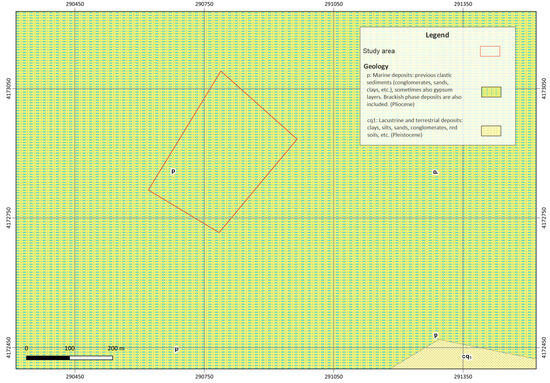 From a geological perspective, the study area is characterized by the presence of clays, sands, and conglomerates, with the potential presence of gypsum layers (Figure 2). These deposits have a marine origin; thus, the presence of fossilized remains is possible.