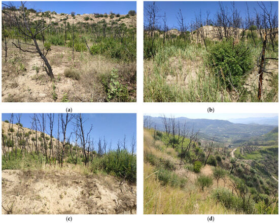 The study area was historically characterized by the presence of Aleppo pine forests (Pinus halepensis), along with a diverse understory of sclerophyllous, broadleaved species. However, it has experienced forest fires at various points in history, notably the severe mega-fire of Ilia and the Peloponnese in 2007, prior to the recent fire in 2021. Following the 2007 mega-fire, the pine forest exhibited a natural recovery process, leading to the establishment of healthy stands. Nevertheless, the landscape underwent significant transformations following the 2021 forest fire. Based on the double-burnt within the last 15 years status of the site, the three-year period field surveys, and a comprehensive assessment of the study area and its surroundings, it is deduced that the likelihood of the site reverting back to its original pine forest state is highly improbable (e.g., [48,49]). Moreover, the documented low cover of legumes, which plays a crucial role in post-fire restoration [50], is considered as inadequate. Post-fire sites of Pinus halepensis forests usually host a large contribution of legumes to vegetation cover and biomass, especially at the early post-fire period [26], which was the period when the present study’s field surveys were applied, a condition that was absent in the study area.