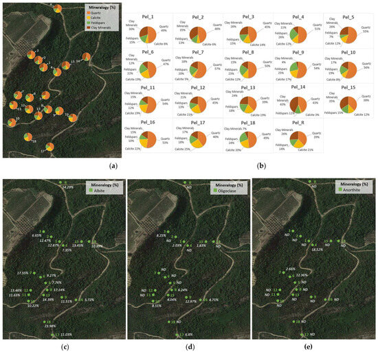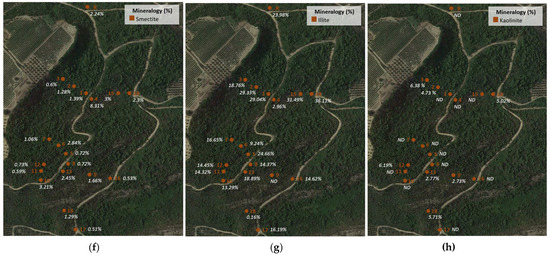 Regarding the clay minerals, montmorillonite (smectite), kaolinite, and illite were identified in the studied area and represented the secondary minerals (Figure 8f–h). In particular, the northern and northeastern part of the area concentrated the highest values of smectite and illite over the southern part, where lower concentrations prevailed (Figure 8f,g). Kaolinite was found in seven sites, with the western and northern part of the area having the highest concentrations and the central and southern part having the lowest (Figure 8h).